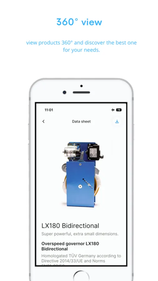• Scan* the QR code found on safety products such as overspeed governors and safety gears to obtain all the technical information: certificate of conformity, type approval certificate, user manual, technical data sheet and relevant catalogue page. If your QR code no longer reads or is not present, don't worry, you can enter your product data manually and get all the documents listed above.