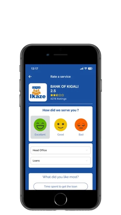 Ikaze App is a service delivery rating application that allows customers to provide feedback on services received at different branches of bank of Kigali as well as digital channels