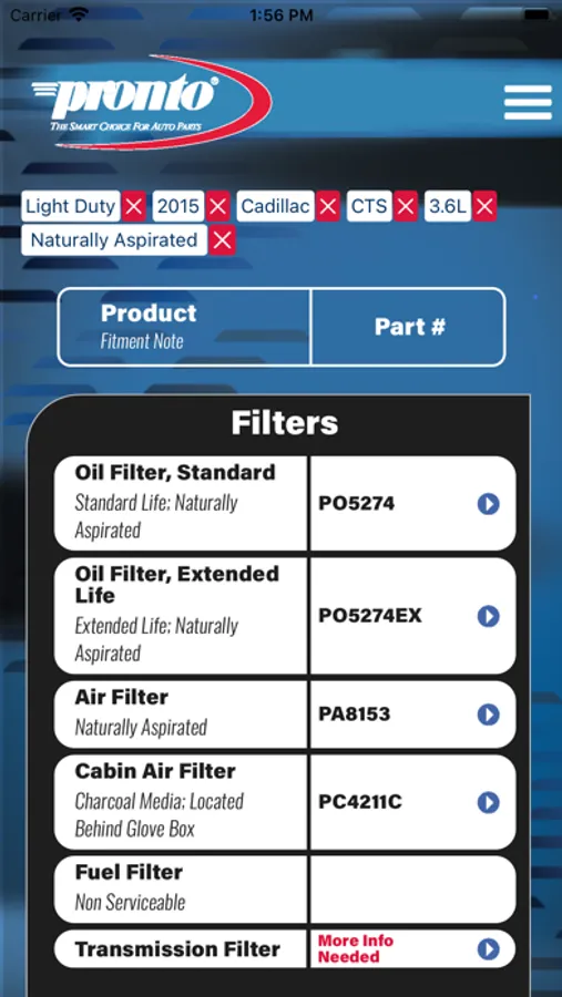 Choose the classic “Search By Vehicle” lookup to search by your vehicle’s year, make, model, and engine or switch to the updated “Dynamic Search”. With the dynamic search box, you can search for your vehicle by typing part or all your vehicle’s description and selecting from the suggestion list. You can also use the dynamic search box to enter a Pronto part number to get to the product information page or enter an OE or competitor part number to interchange it to a Pronto part.