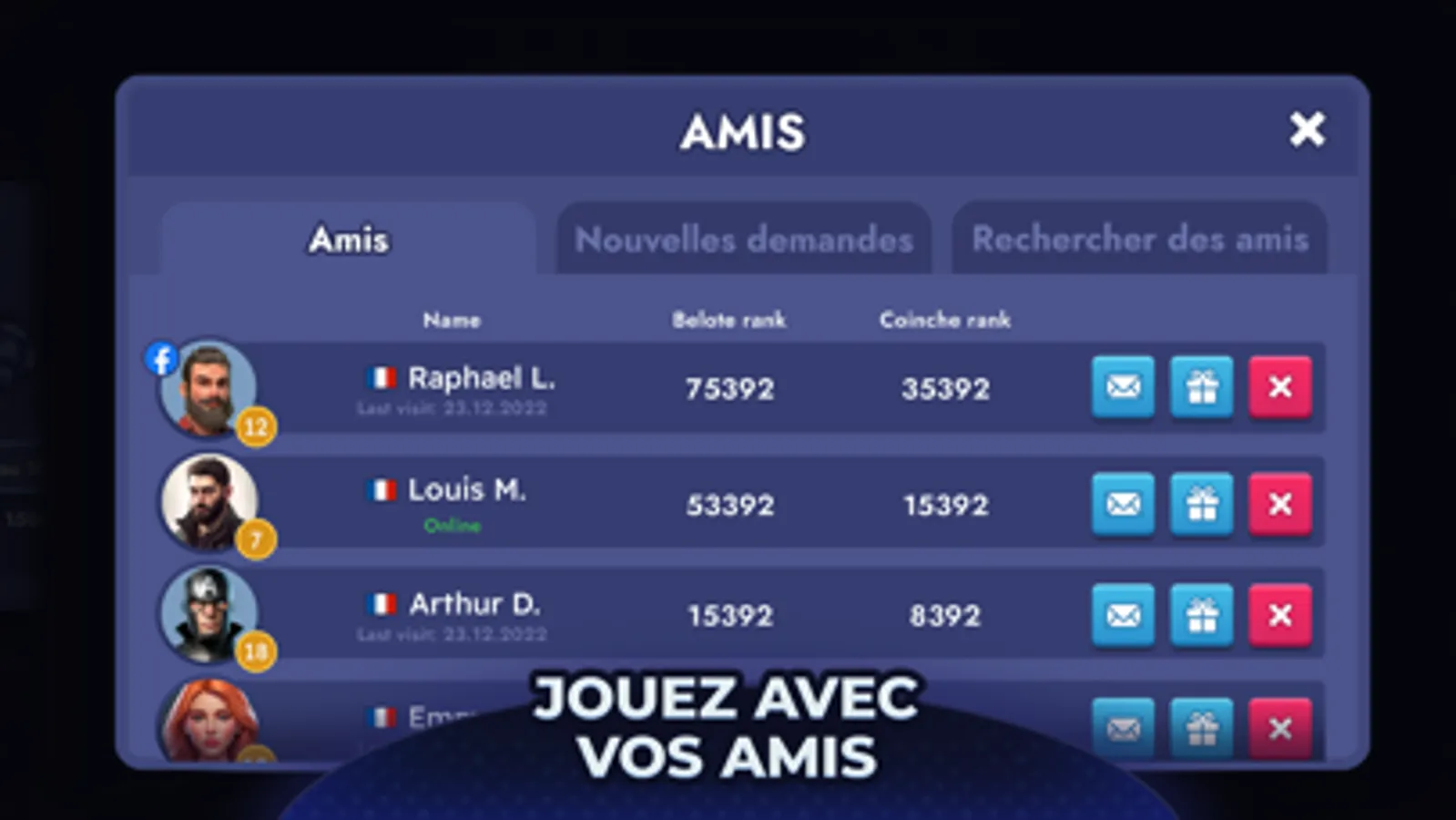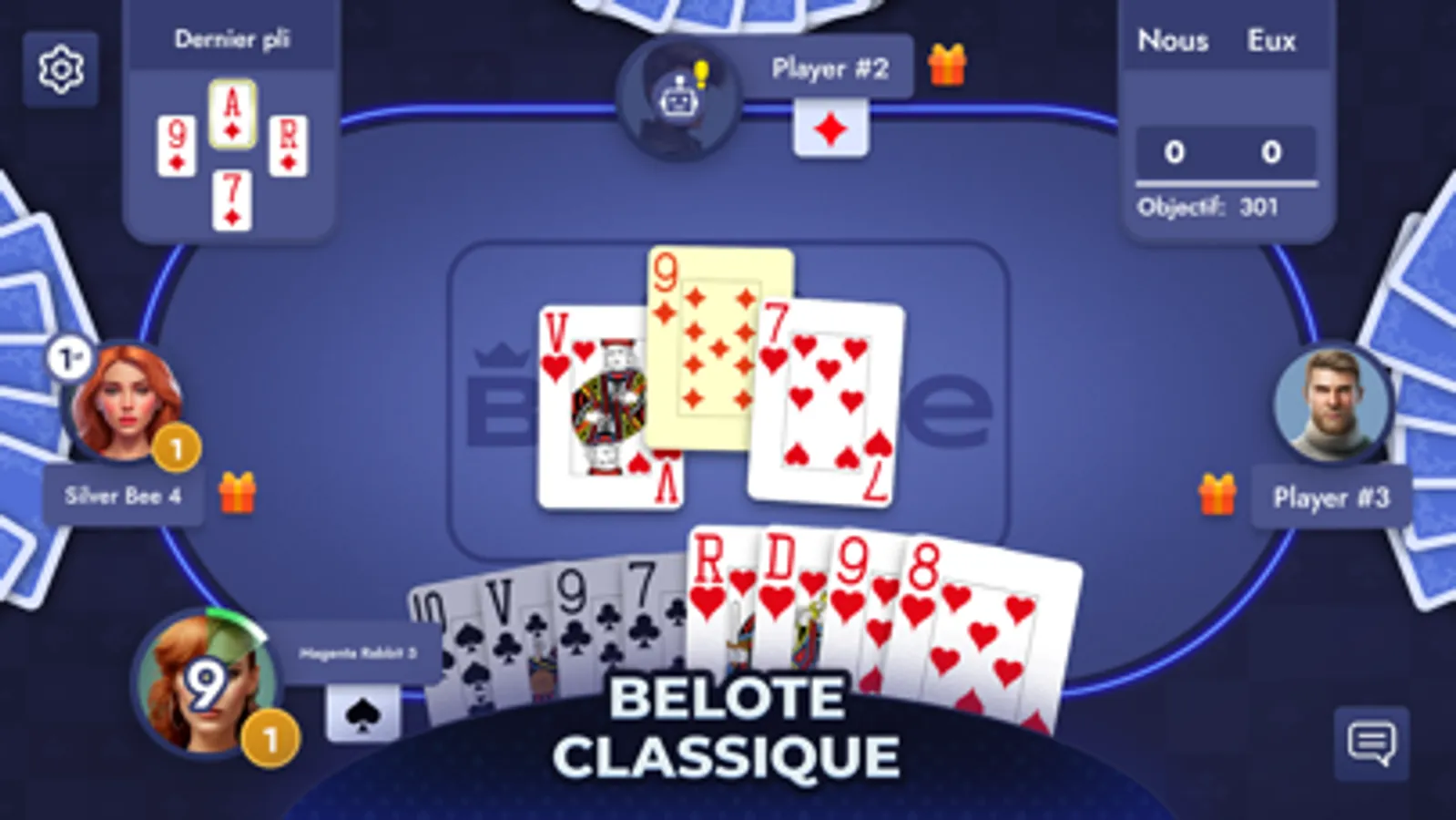 So what are you waiting for? Play Belote or Blot, Blote, Coinche Contrée (what name are you used to?) and join the thousands of players at the tables and compete with them to win!