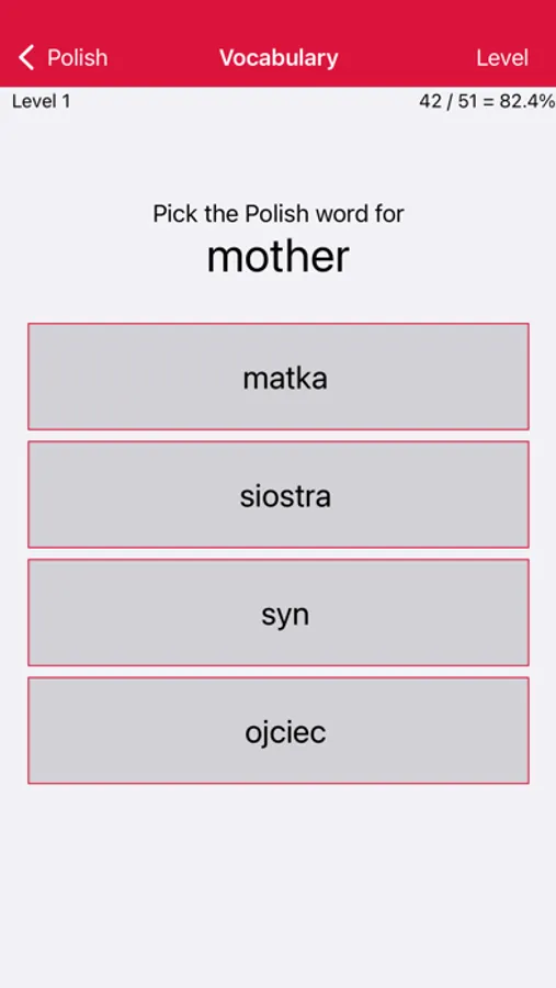 • Vocabulary: 150 levels, each testing the meanings of ten Polish words. Interspersed among these are cumulative levels reviewing what has been learned earlier (giving a total of 170 levels).