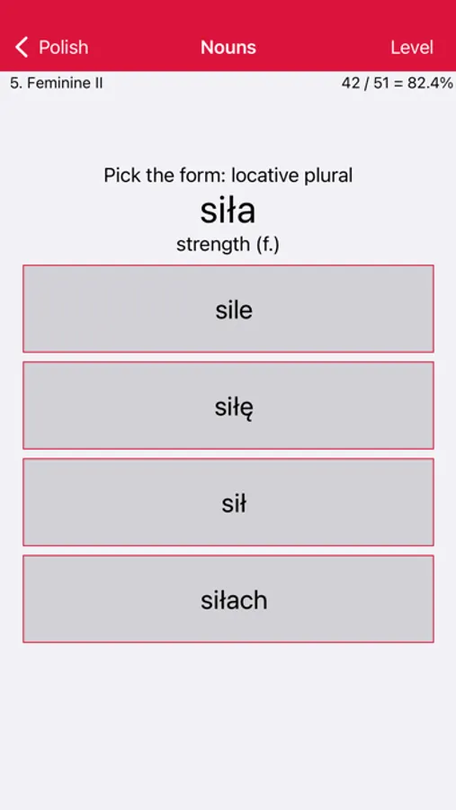 Wherever you have your phone and a free moment, it offers a continuous multiple-choice test on Polish vocabulary and grammar. Each answer you give is immediately confirmed or corrected, and your knowledge is reinforced by repetition.