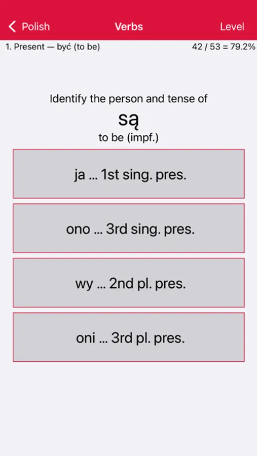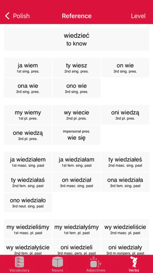 • Verbs: Tests your ability to parse and to conjugate a range of representative Polish verbs.