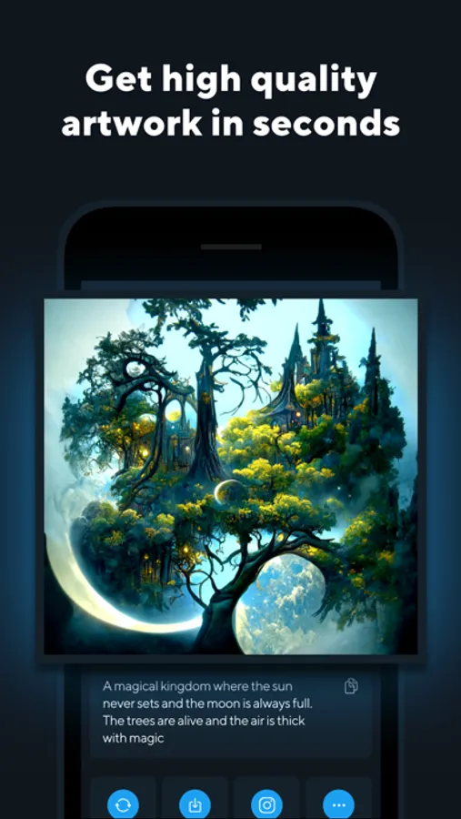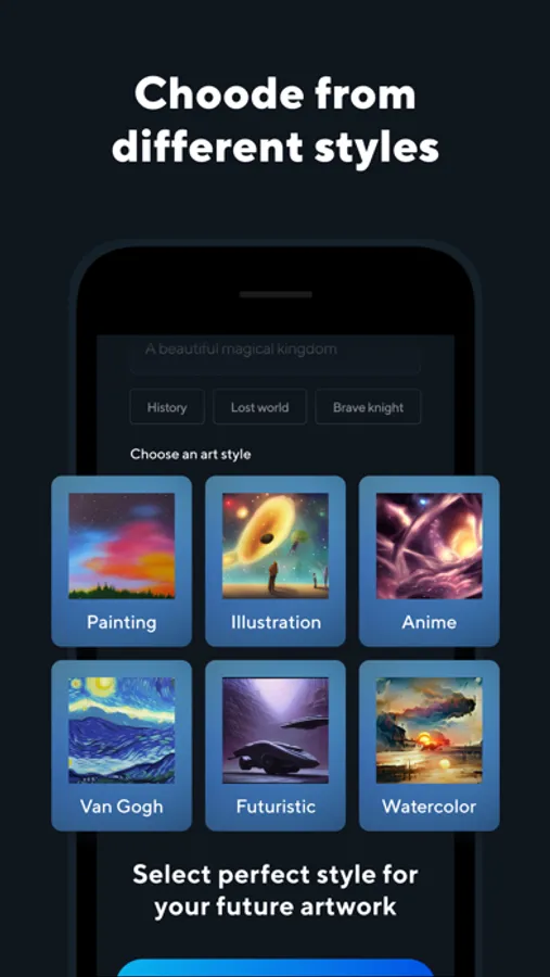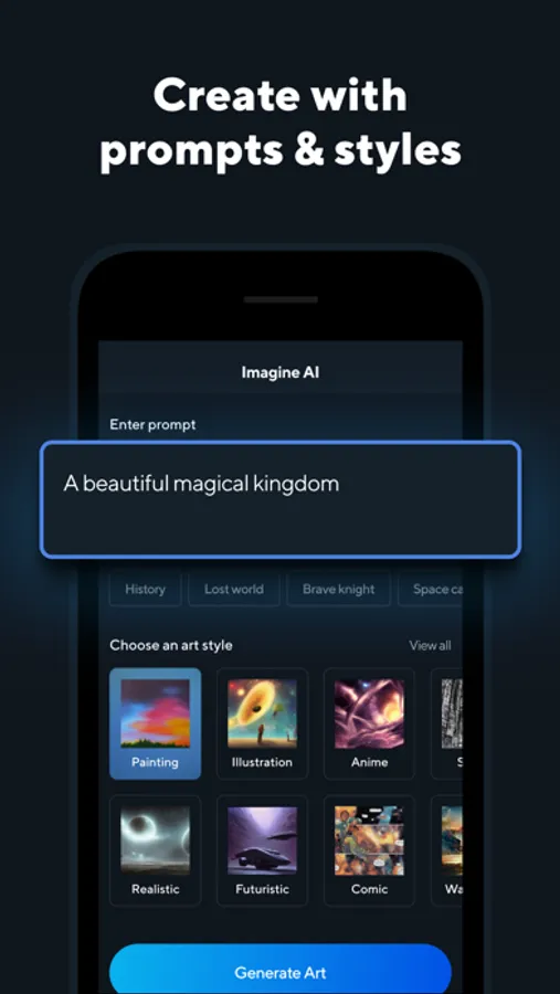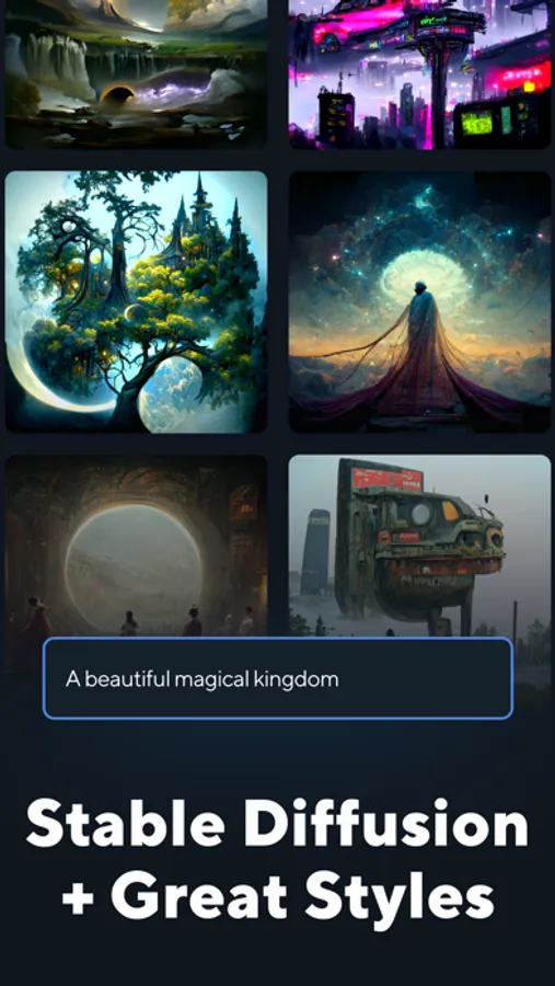 Unleash your creativity by creating art with artificial intelligence! Artist AI is the best app to have fun while easily creating unique, beautiful art! Just type in a text prompt, choose an awesome style, and in just a few seconds you’ll have a beautiful, unique artwork that the world has never seen before.