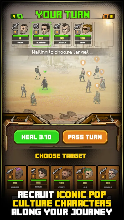 - 5V5 turn based RPG combat with team reaching 15 survivors.