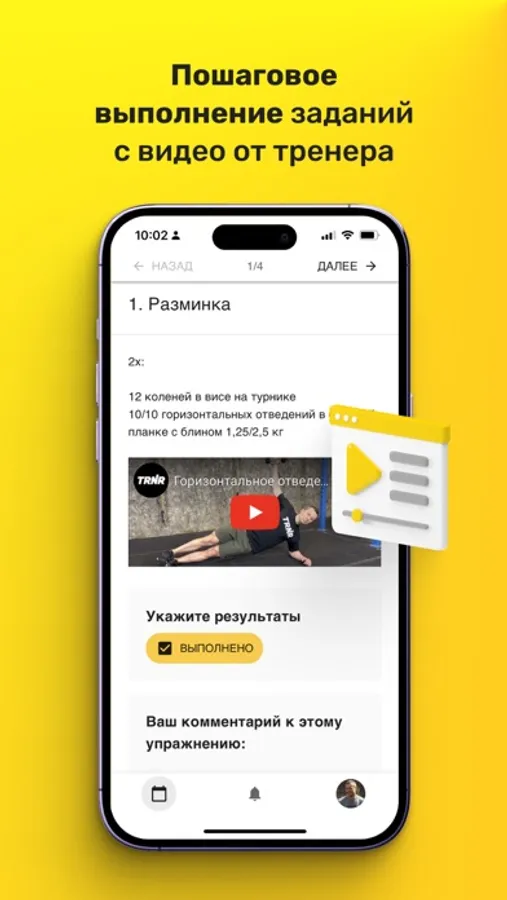 - Получайте уведомления о новых тренировках и сообщениях от тренера.