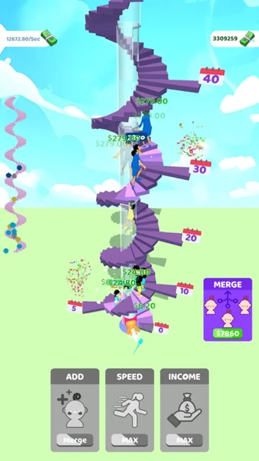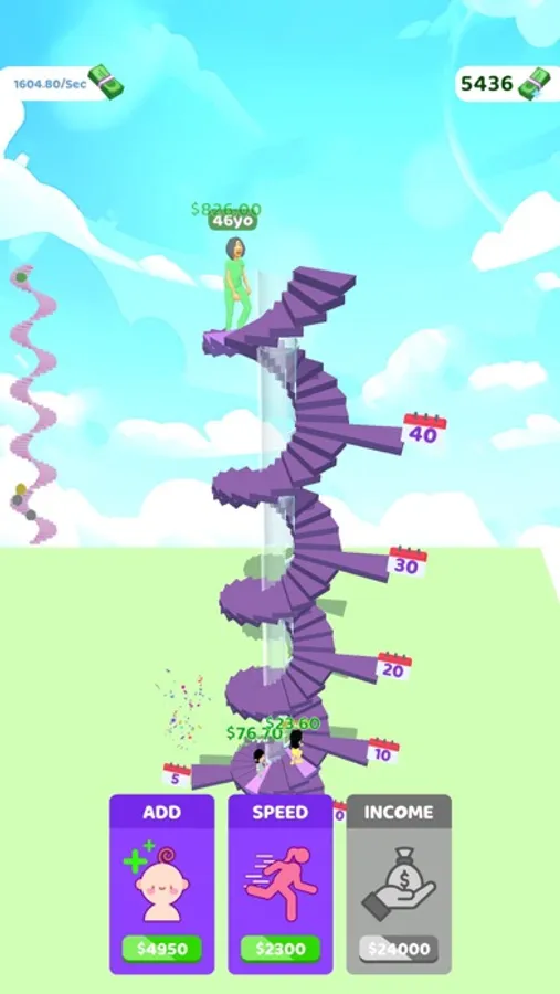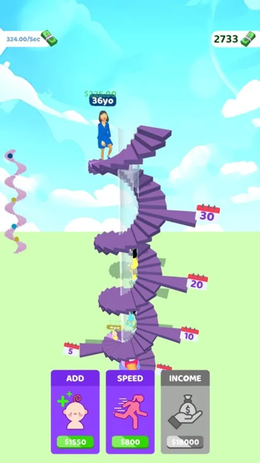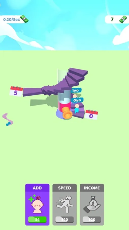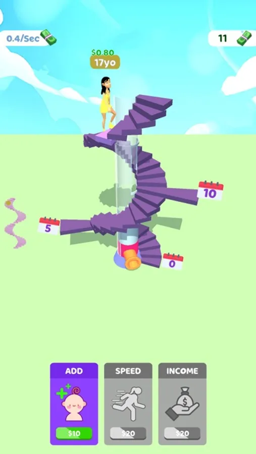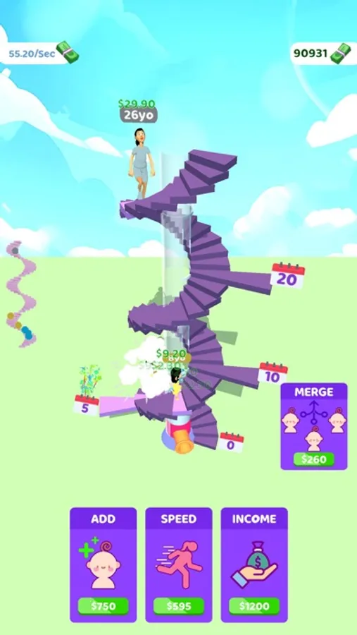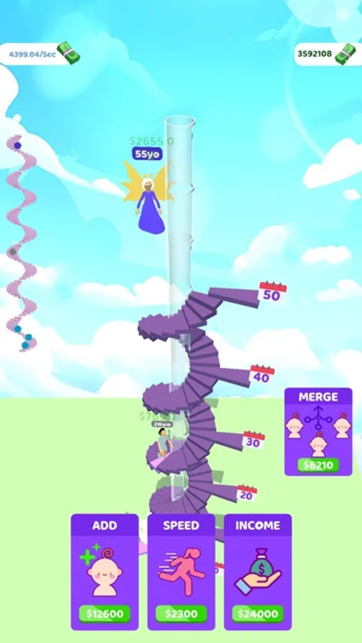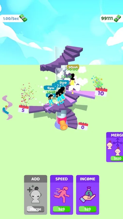 Add new characters to the journey of life! Every color represents a different length of life! You can merge your characters to make them go further and earn more money when you have 3 of them in the same color.