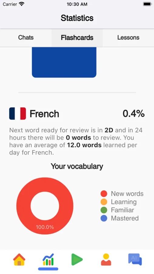 Wordoss also gives you pre-made flashcards and with statistics, you can see how you're holding up.