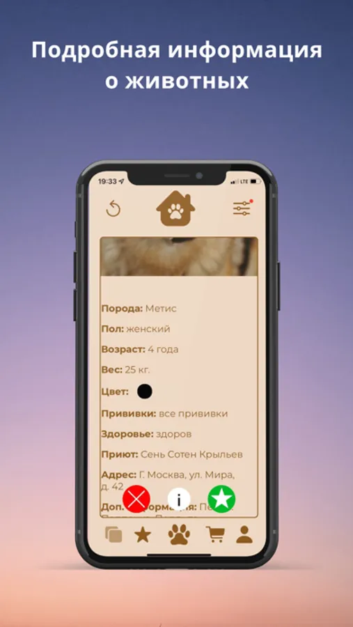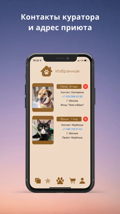 Как только вам понравилось животное, просто нажмите на звездочку и питомец сразу отобразится у вас в избранном, но уже с номером телефона куратора и местом, где можно провести первую встречу с вашим будущим питомцем!