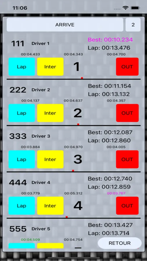 Race : permet de chronométrer plusieurs concurrent sur 1, 2, ou 3 partiels et d'enregistrer leurs temps, plus adapter à la course il permet de démarrer tous les chronos en même temps, et de défiler les concurrent en fonction de leurs positions théorique sur le circuit.