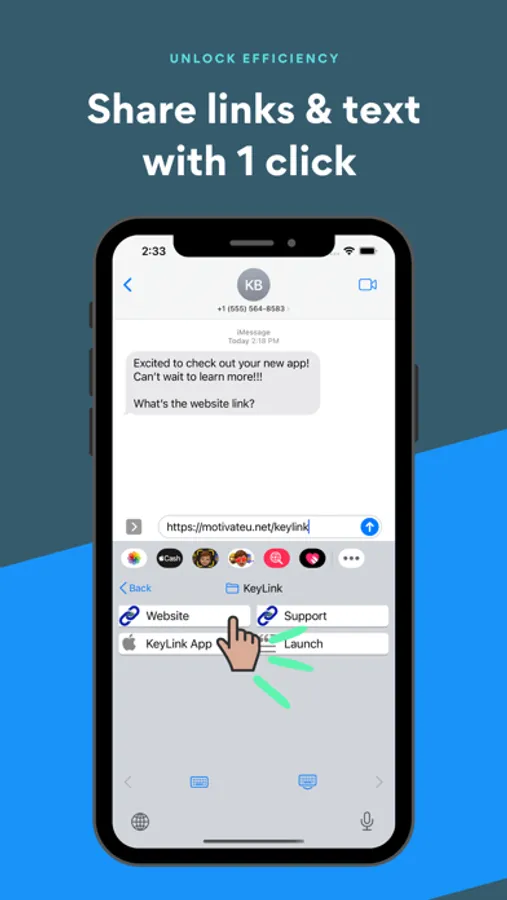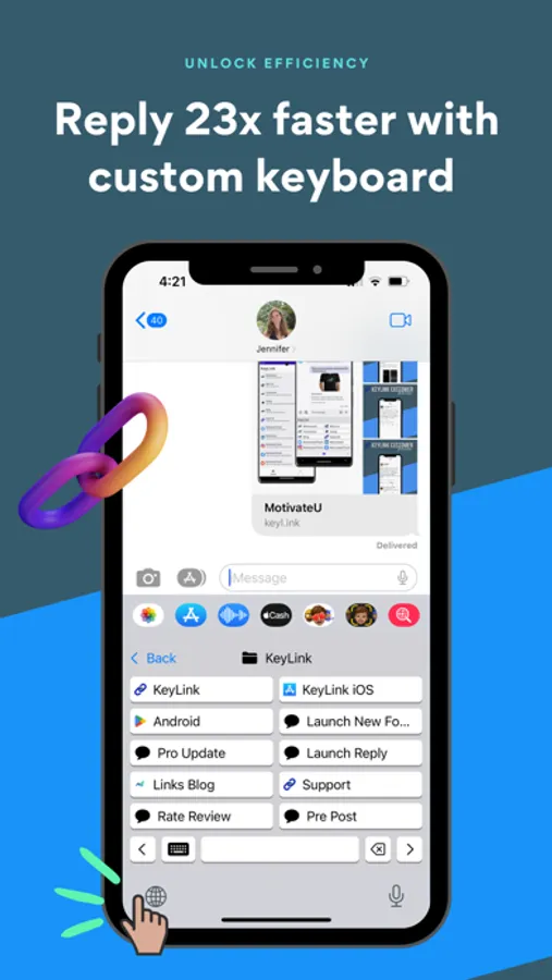 KeyLink is a custom keyboard that enables you to easily store, access, and share common links and text, such as your website, product and affiliate links, social media accounts, common responses to FAQs, taglines, and more. Download today and reply and apply within any app 23 times faster all with just 1 click of your custom keyboard!