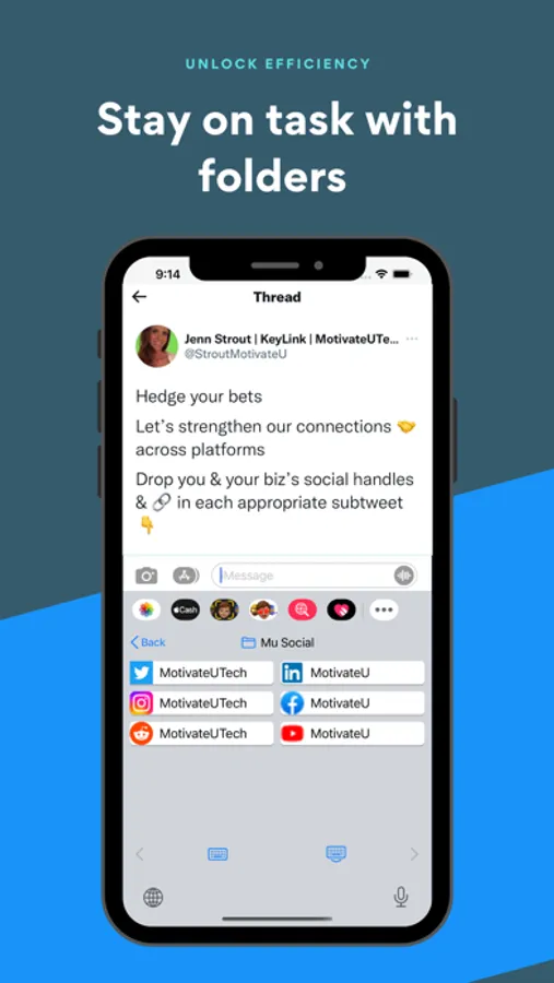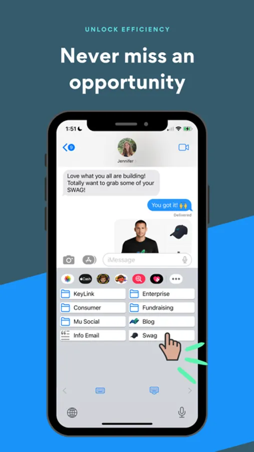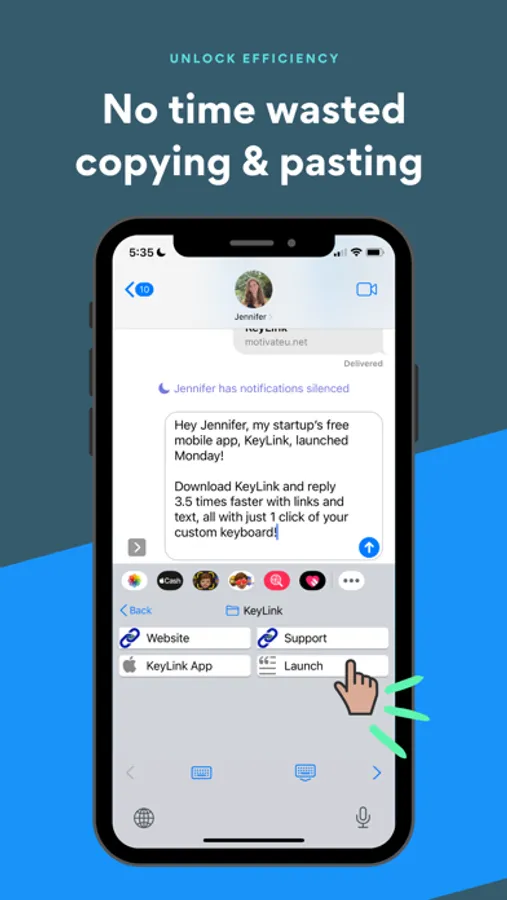 Responding to clients, prospects, investors, etc. is time consuming, but delaying a response is costly. With KeyLink you can quickly and easily add taglines, marketing messages, product or job descriptions, and other commonly shared information! Share sentences and paragraphs with just 1 click, no more copying and pasting dozens of messages from notes or docs! Efficiently reply to emails, texts, social media posts, direct messages, with your custom KeyLink keyboard!