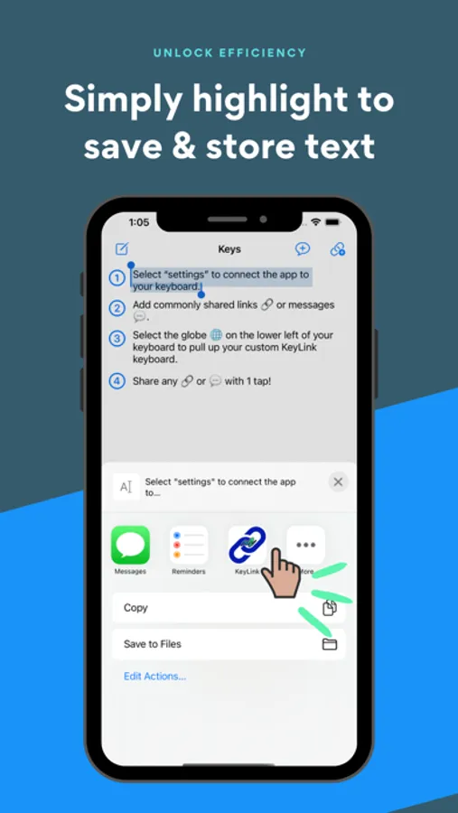 Now with KeyLink’s share extension, allowing you to instantly save a link to KeyLink with any app’s share function and also allowing you to highlight text to directly save it as a Key within KeyLink. You can then share stored links & text with just 1 click of your keyboard directly within any app. KeyLink: Unlock efficiency.