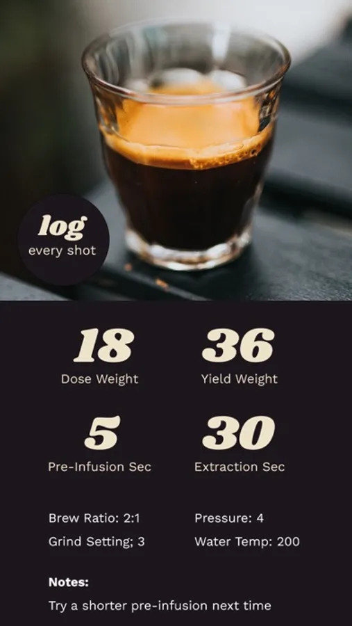 - Track every variable like a pro barista: beans, grind, dose weight, yield weight, brew ratio, pressure, pre-infusion time, extraction time