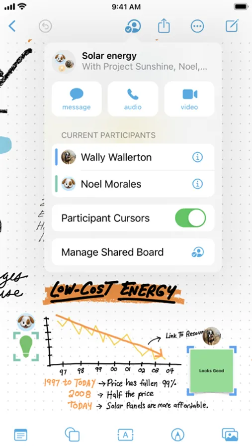 • Communicate with Messages or FaceTime. When you’re working on a board with others, you can jump into the associated Messages conversation or start a FaceTime call with your collaborators with a single tap.