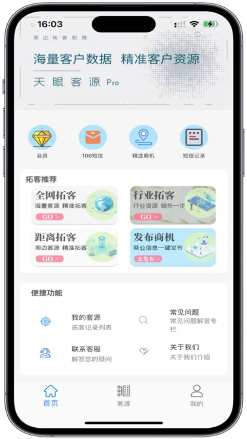 天眼客源app 提供关键字企业查询,全行业企业查询,周边客户查询,附近客源查询,供需求查询等多项功能。并提供快速采集入口,可有效提高获客效率。降低获客成本。