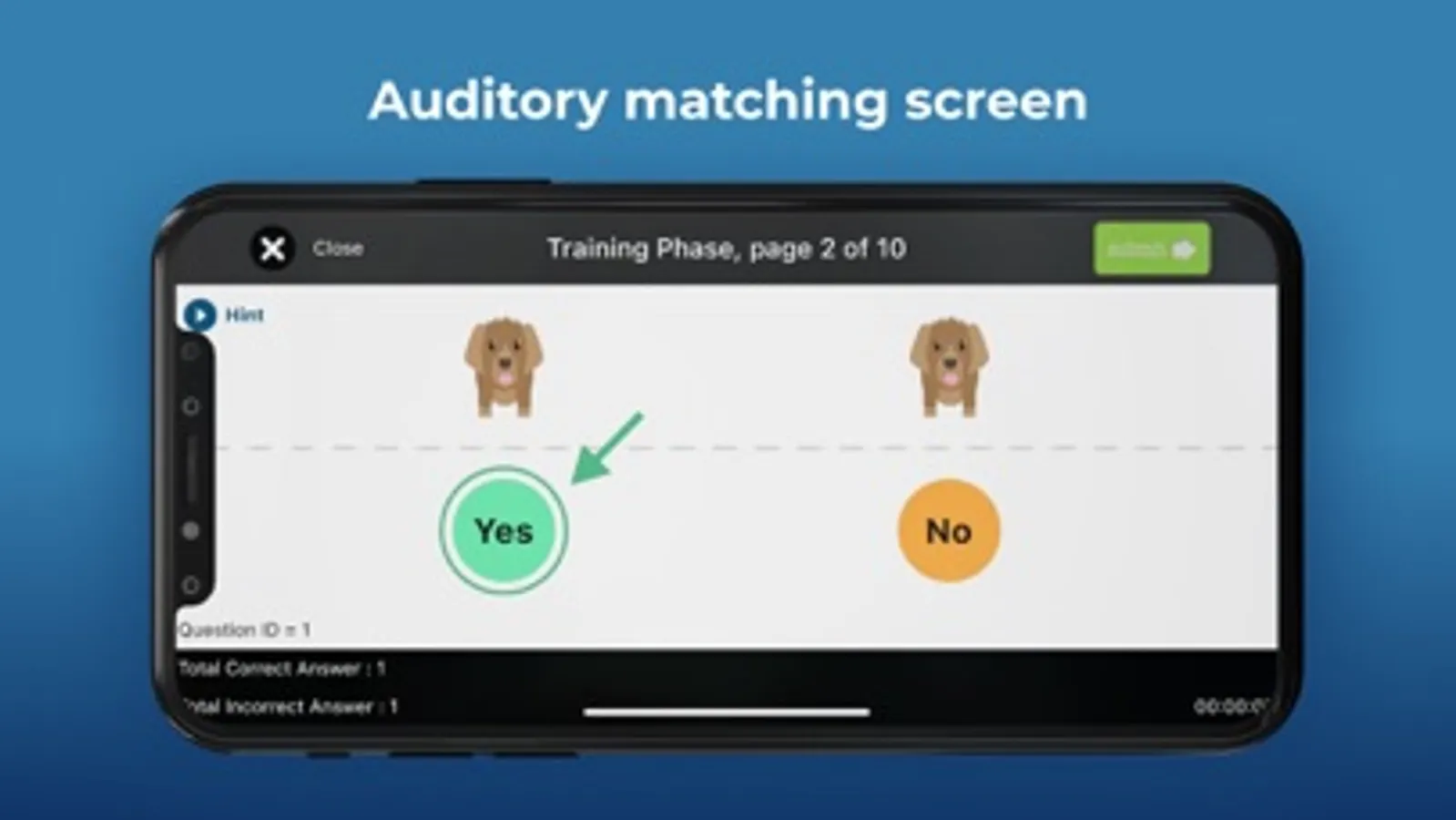 Auditory match to sample is fundamental to listener literacy (responding to vowel-consonant sounds of a speaker by performing relevant listener responses), enhancement of echoic responding (reproducing the heard words with point-to-point correspondence), and may play a possible role in the emergence of Naming (the joint of listener and speaker responses). Sounds the Same app teaches the students to discriminate between positive and negative exemplars of different sounds and words by matching the sample sound to the positive exemplar. For example, match the sound of running water versus the sound of door knocking. The Sounds the Same app consists of two sections: basic and advanced. The 8-phase Basic Auditory Matching teaches students to match target sounds/words versus no sound, white noise, and other sounds/words. The 13-phase Advanced Auditory Matching teaches students to match relative longer words, short phrases, and even sentences. The differences between the target sounds and the non-exemplars decrease incrementally and the complexity in the exemplars increase gradually from basic to advanced phases.
