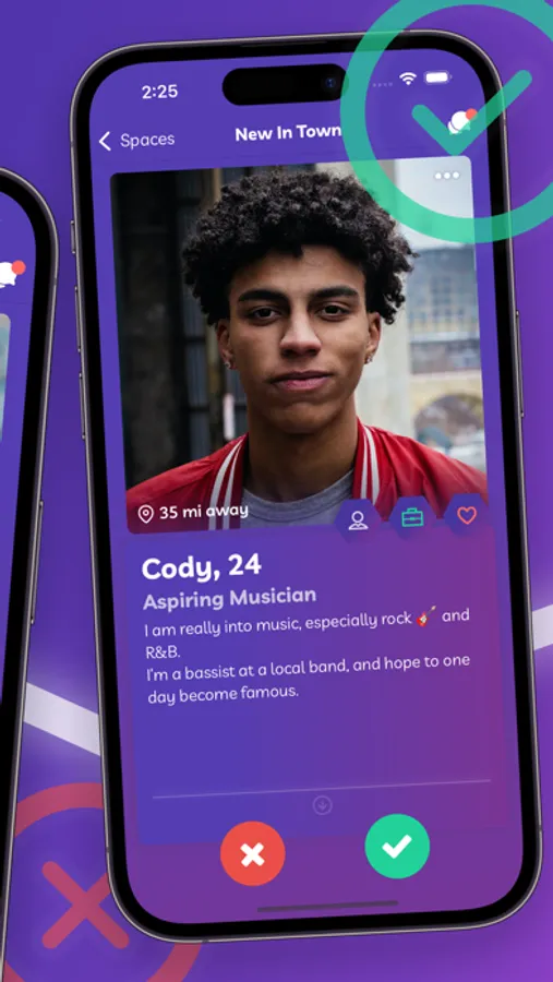Inside each space, you will be shown other people in it who fit your preferences. Choose who you would like to meet (or not), one person at a time.
