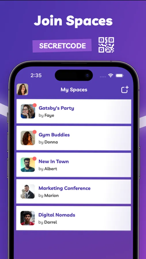 Find and join a public space that seems interesting, or join a private space by entering or scanning its unique (text or QR) code.