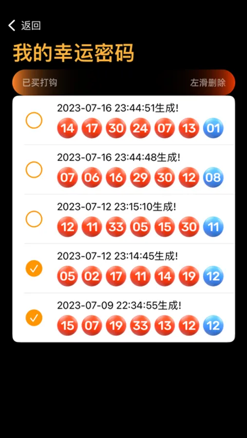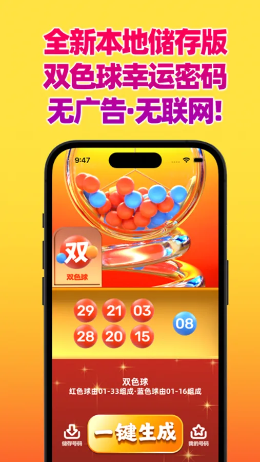 软件功能简洁实用,随机只属于自己的幸运密码,比现场机选更智能更安全,一触即发,新增本地储存,全程无联网!