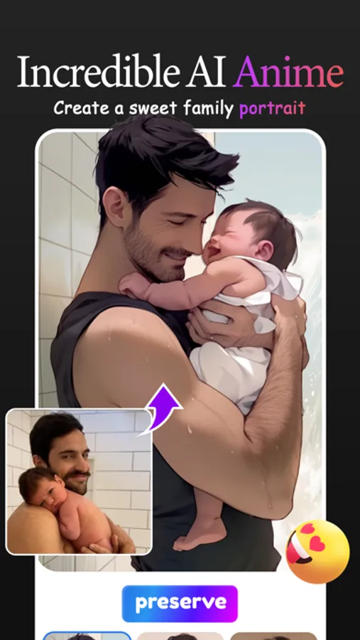 Try photo in tune with baby, mate and family. Transfer them into art style in one click. Image baby become anime character, mate change to super hero and family take an ID photo in steampunk