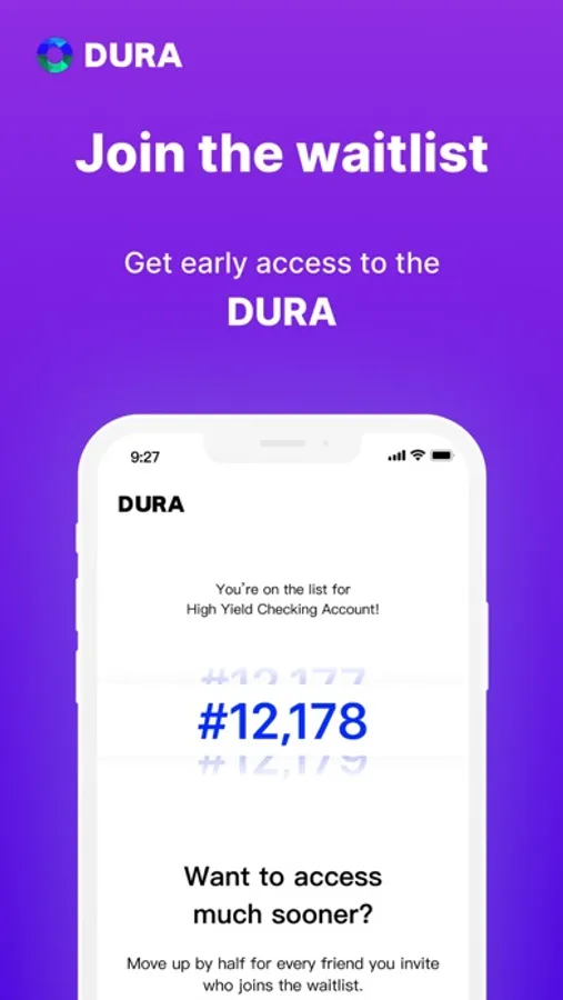 Dura is a soon-to-be-launched app that provides FDIC-insured, 4.5% APY checking accounts to help users quickly grow their savings. Our mission is to make it easy for users to turn their everyday savings into their financial goals, with no hidden fees. By downloading our app and joining our waitlist, you'll be among the first to experience our innovative way of managing your money.