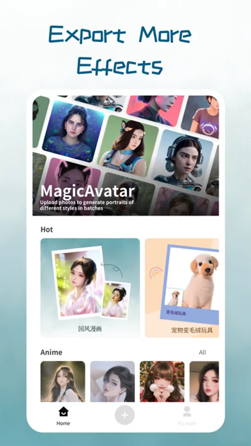 No matter it’s 3D style, Artbook style, inkpainting style, sexy cat ear style, cyberpunk style or gentle style, little devil style, just upload a photo of you, and AI can help you draw your Anime photos , all beauties/handsome guys, let's break the wall of the dimension together!