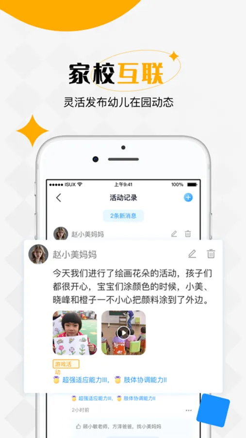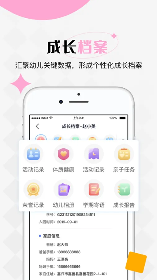 活动管理、亲子任务、幼儿相册、体质健康、学期寄语等功能。