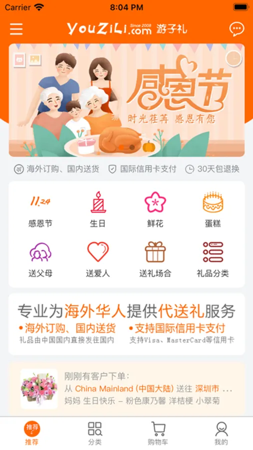 游子礼(YouZiLi.com)所设立的网上商城独创性地采用了海外订购、国内送货的跨国操作方式,使海外游子以往难以实现的寄送鲜花、蛋糕等时鲜礼品的愿望得以成真。我们网状的配送系统已经覆盖了国内所有城市和地区,形成国内最迅速、最安全、最方便、最完备的礼品递送网络,保证了您的礼品能够及时无误地送达。游子礼(YouZiLi.com)的全体职员将全心、全力使您及亲友的真情传递锦上添花。