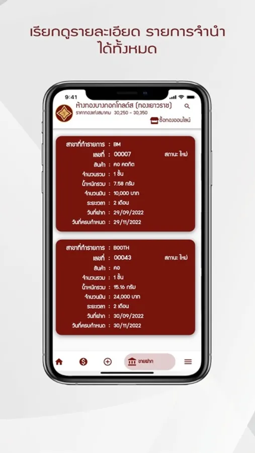 • ลดความยุ่งยาก สามารถดูความเคลื่อนไหวและประวัติ รายการขายฝาก, รายการซื้อสินค้า และออมทอง ได้ครบในแอพเดียว