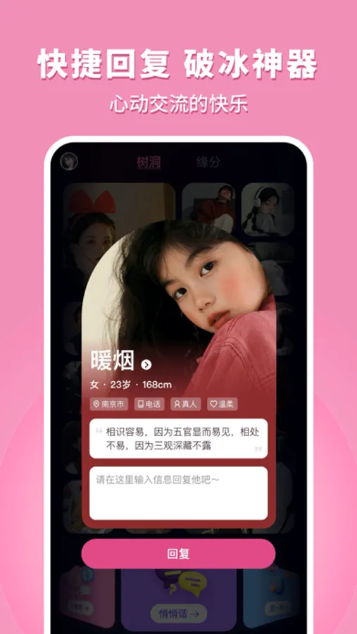 附近树洞,一个只属于你的秘密空间,寻找到同频磁场的有缘人,那些内心的孤独、坚强后的柔弱、最深处的心声都可以尽情倾诉,匿名加密,毫无顾忌卸下伪装,接收心跳加速的信号~