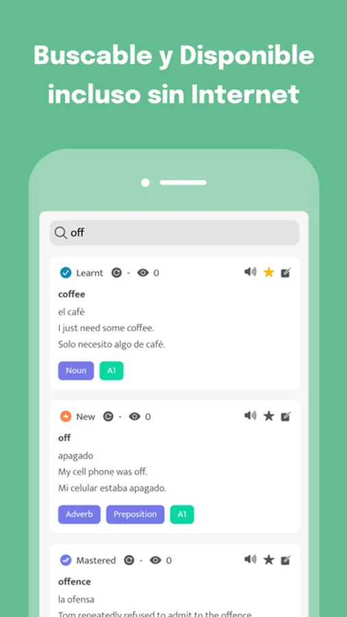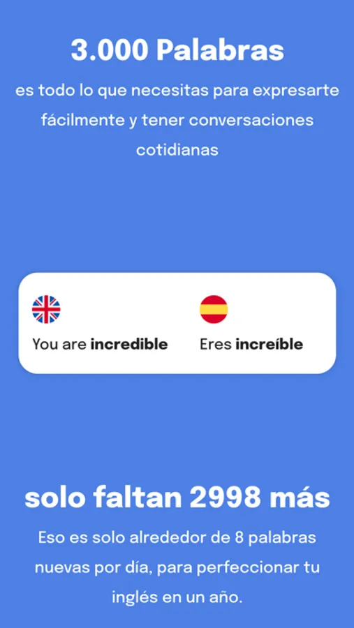 3000 palabras es todo lo que necesitas para expresarte fácilmente y tener conversaciones cotidianas en un idioma. Esta aplicación tiene todas las más comunes en español, siempre disponibles en tu teléfono, incluso sin conexión.
