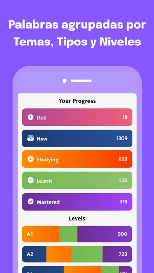 Filtrar por niveles (A1, A2, B1, B2), temas, 100 grupos principales y partes del discurso