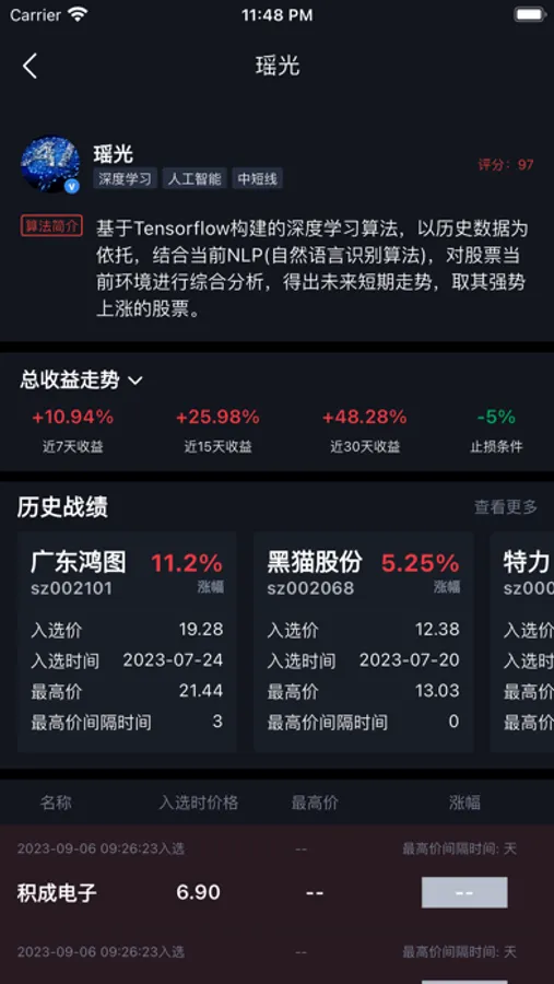 历经两次主力资金加仓确认,且具有一定趋势的股票,盘中实时监控每一只股票,对 符合要求的股票匹配历史算法模型,都符合才能选出来。