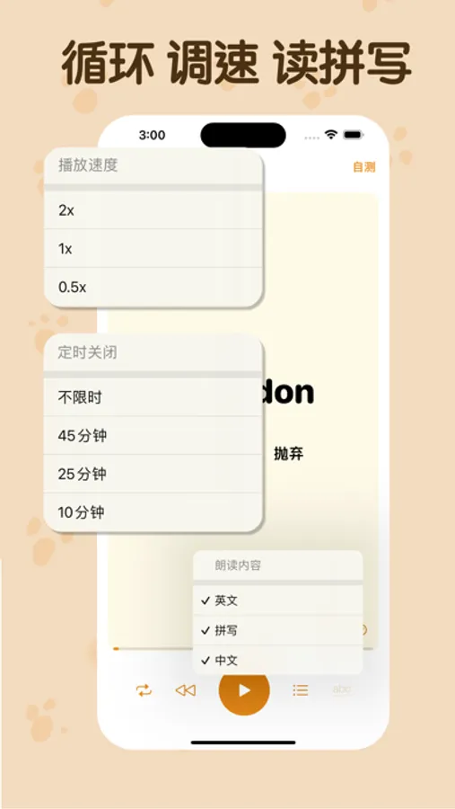 磨耳可以切换三个倍速的朗诵速度,适合你不同阶段的听词需求。