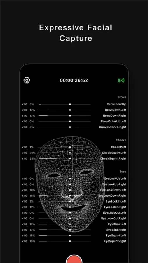 「动作录制」将所有面部动作捕捉保存本地数据,可导出进行二次开发。