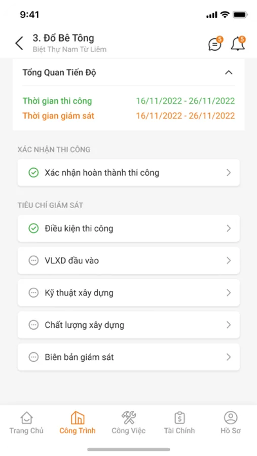 + Cập nhật tiến độ công trình theo từng ngày