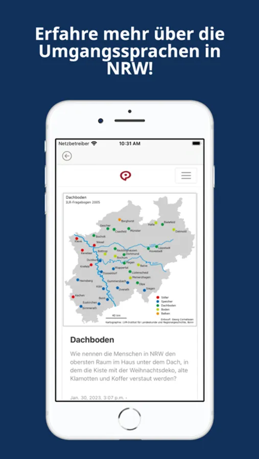Hinter dem ersten Button kannst du die spannenden Fragerunden entdecken. Die meisten Fragen kannst du ganz einfach wie bei Sprachnachrichten einsprechen. Natürlich alles anonym. Wenn du acht Fragen beantwortet hast, erwartet dich eine Extra-Aufgabe. Hier wird dein Wissen über interessante und lustige Redewendungen, Sprichwörter oder Formulierungen aus NRW abgefragt!