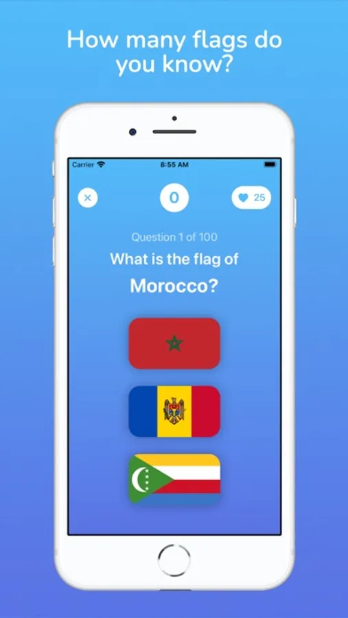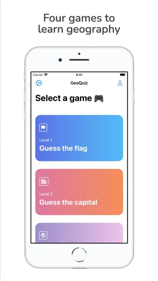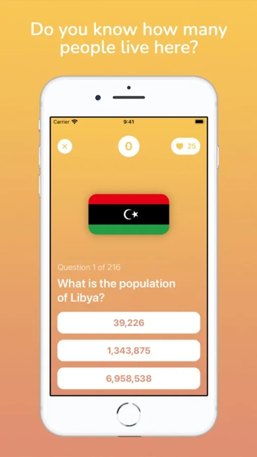 Four different games to play: Guess the flag, guess the capital, guess the country and guess the population.
