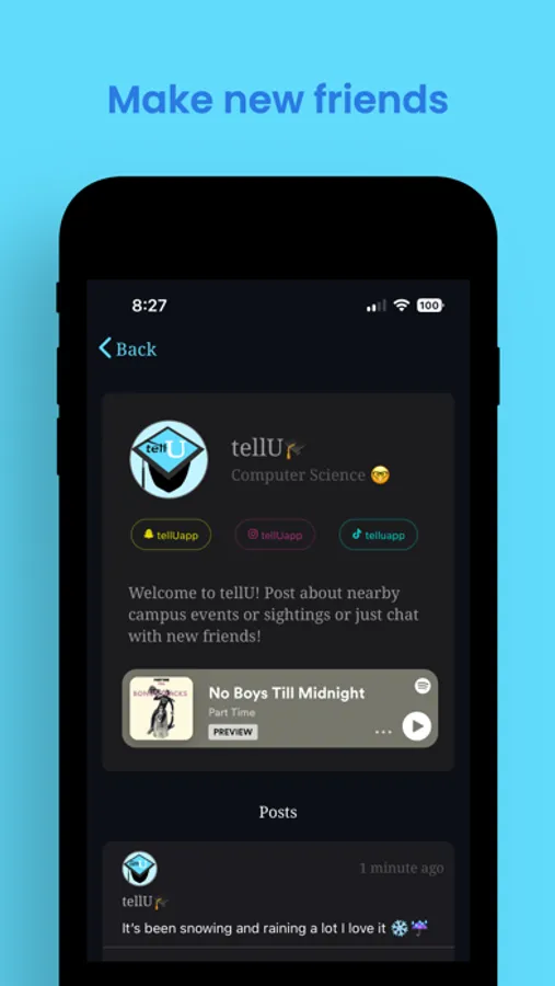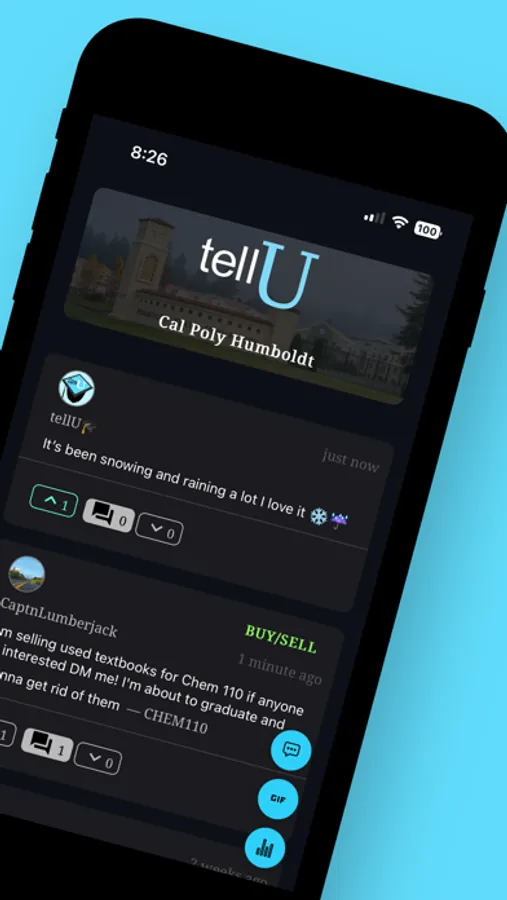 The tellU app puts students into chat rooms with their fellow university students. Post about nearby campus events or sightings, or just chat with new friends!