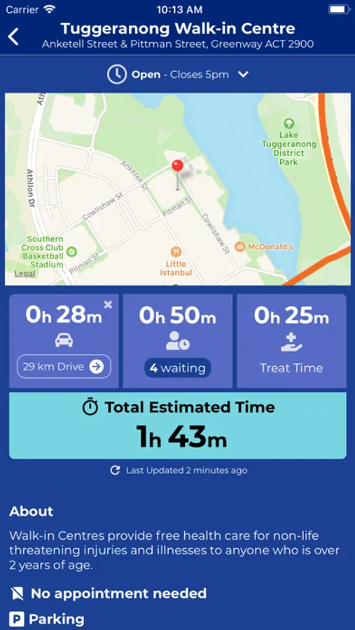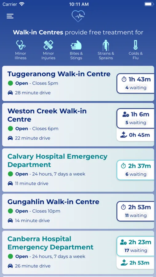 The ACT Health app provides detailed hospital emergency department and walk-in centre wait times, travel times and directions to your nearest facility.