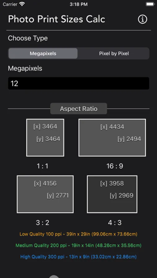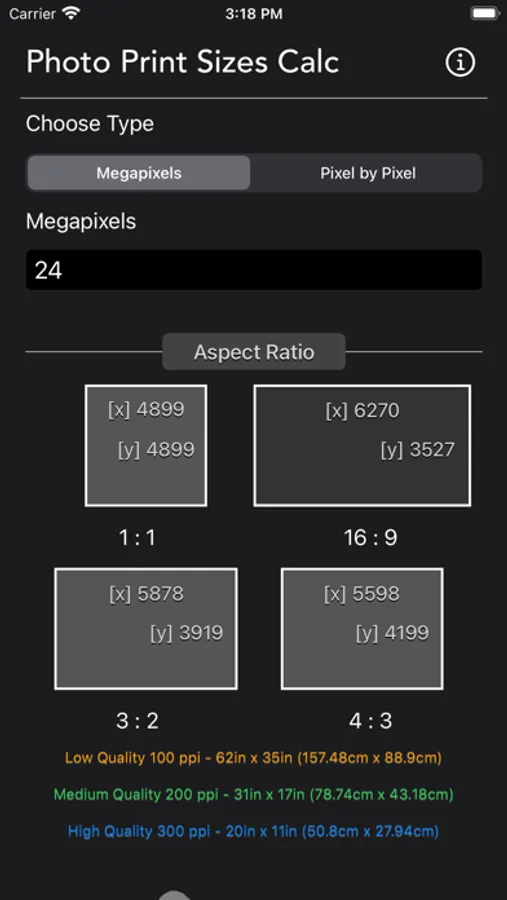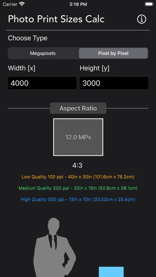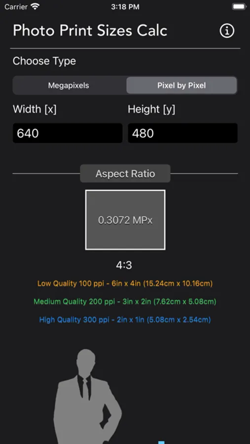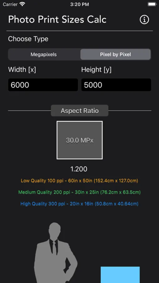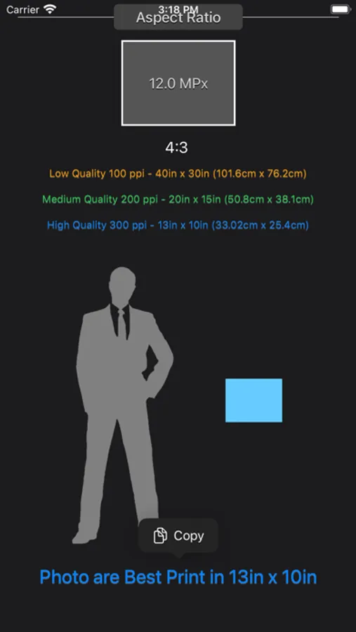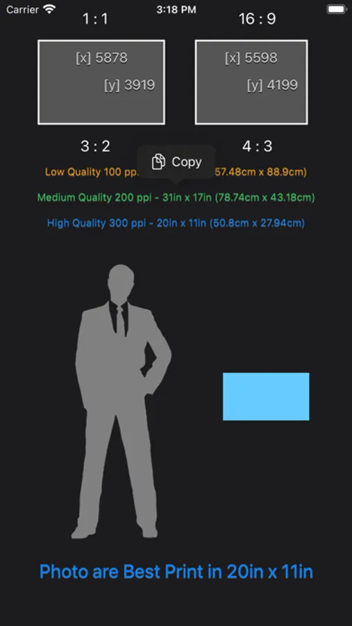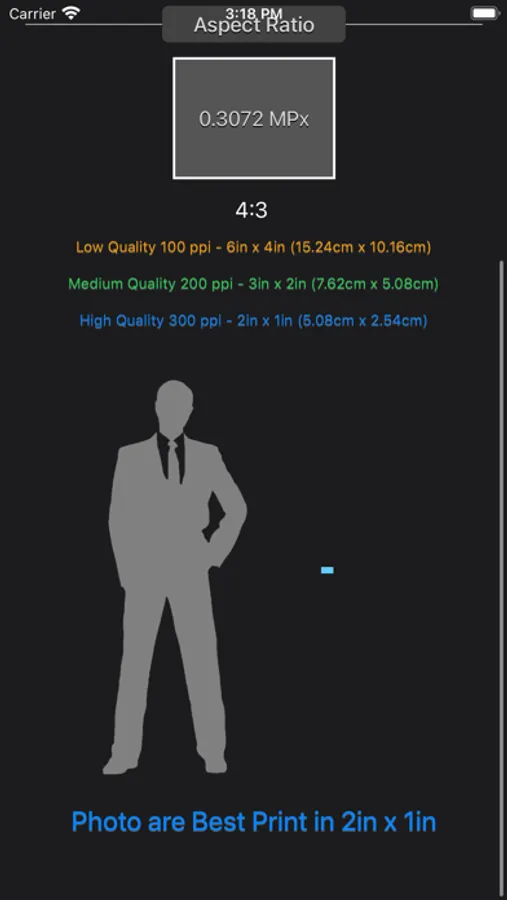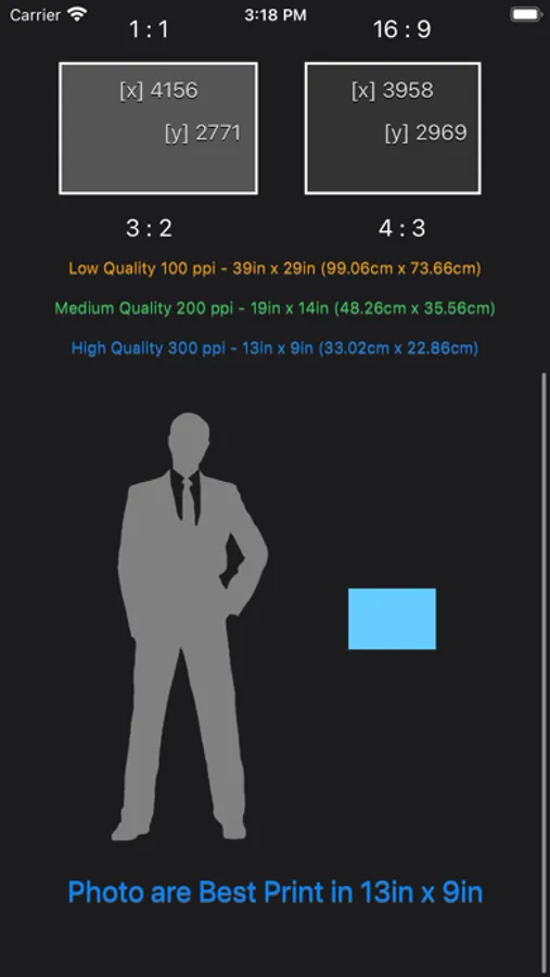 Beside providing the 3 quality print size, which is poor, standard and great quality. The app also displays the print size along with human scale so you can better understand how large is the print base on your input.