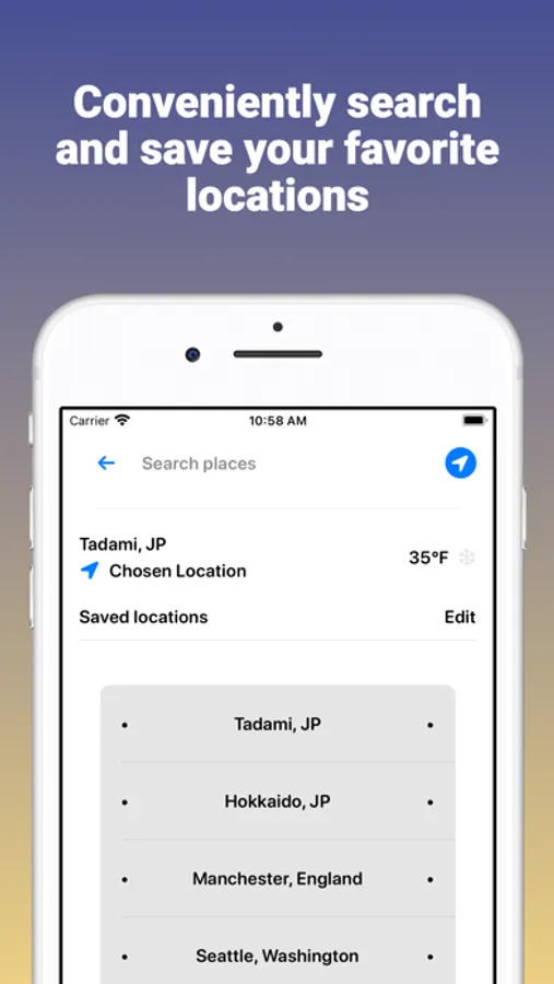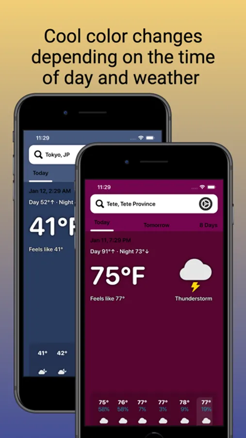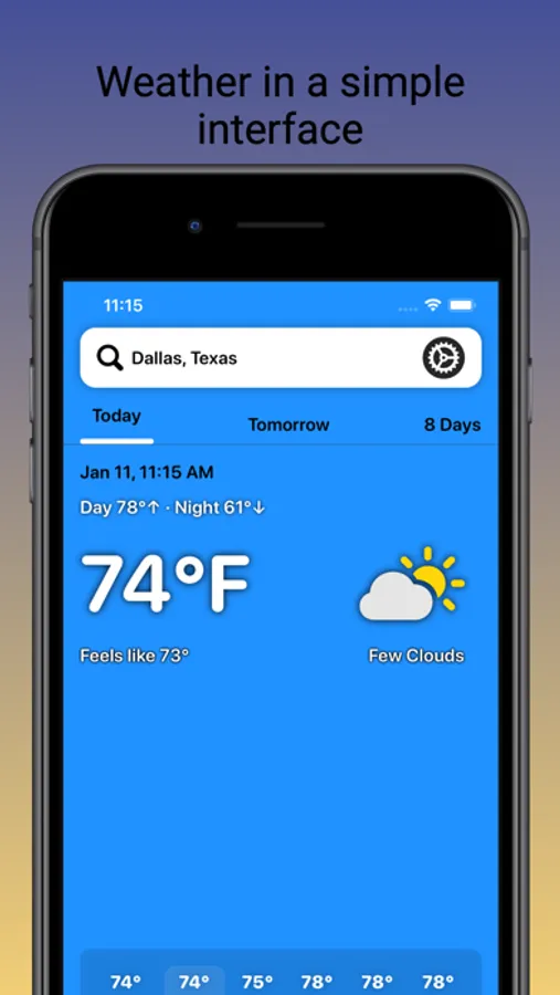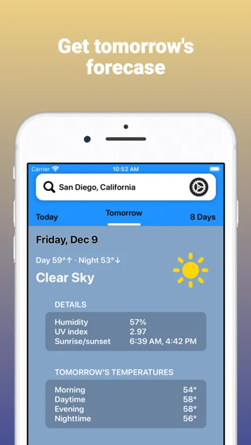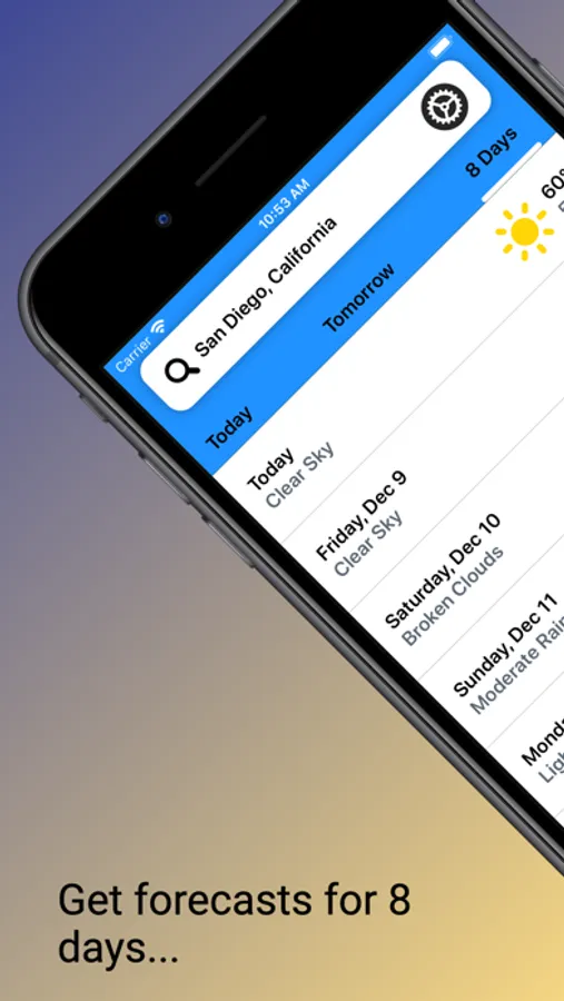 Get the weather for your location with ease. Get weather for other location and save them to your device for future use! Get weather for today, tomorrow, and the next 8 days! With GooWeather, you'll get what you need to make smart decisions about how to dress or what to expect for outside conditions. With a background that changes depending on the time of day and weather conditions, you'll understand more about the weather conditions for whatever place you decide to inquire about.