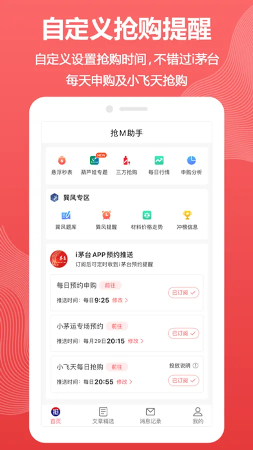 自定义申购i茅台时间,到点自动提醒预约。包含每月29日小茅运专场申购提醒以及小飞天抢购提醒