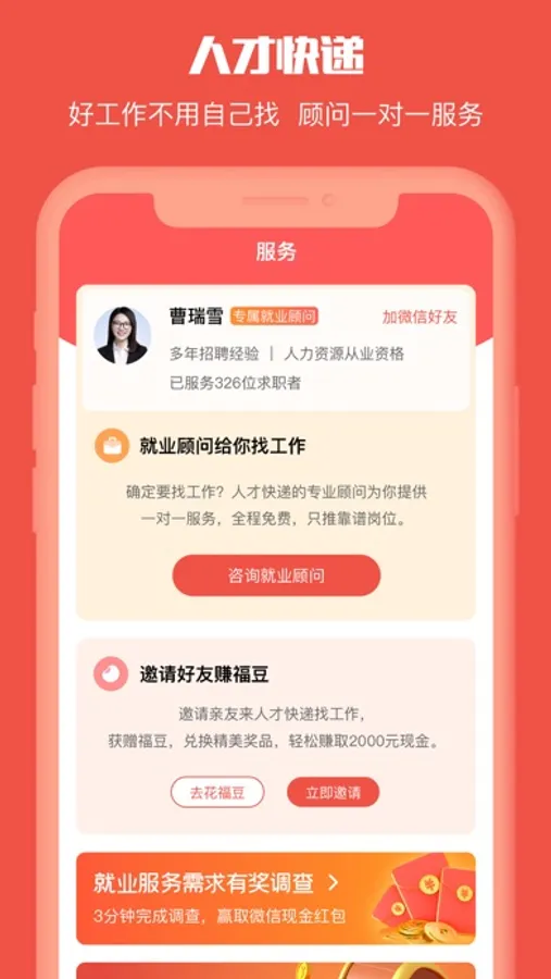 人才快递更提供给你一个专属就业顾问,工作不想自己找,顾问直接帮你找!找工作进度随时问,入职后也对你负责。工作有问题,找她;想换工作了,找她;别人没有的,我们也有!
