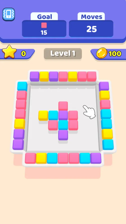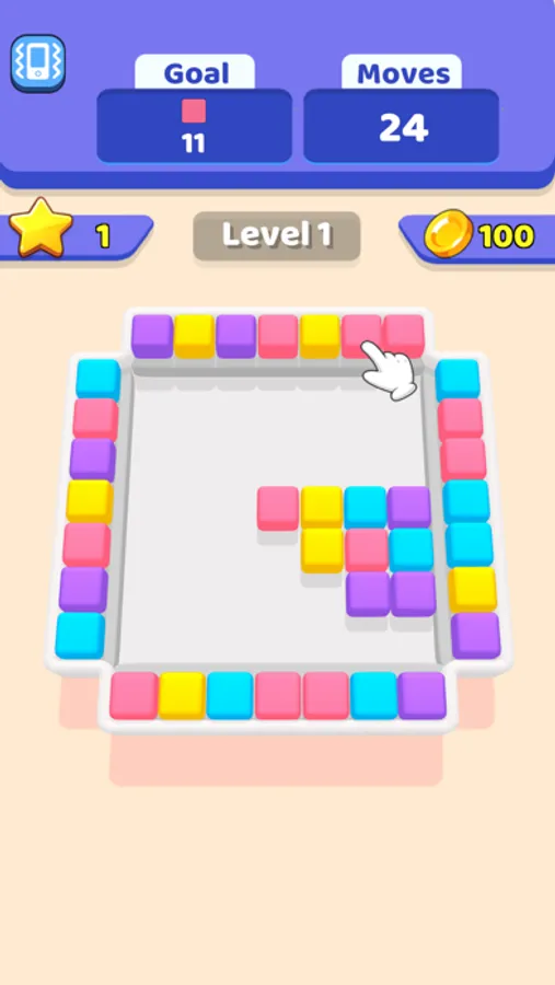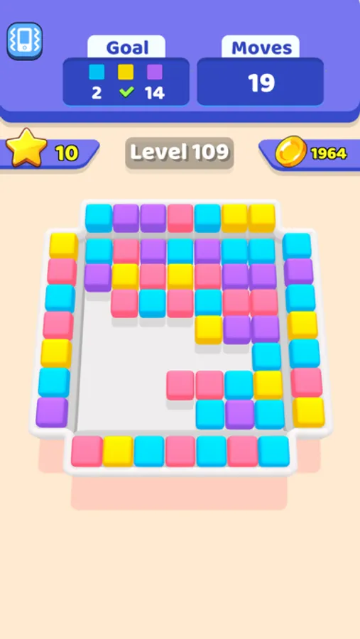 Swipe the screen with your finger, up, down, left, and right to make the squares move obliquely, collide with each other, and eliminate three or more squares of the same color.