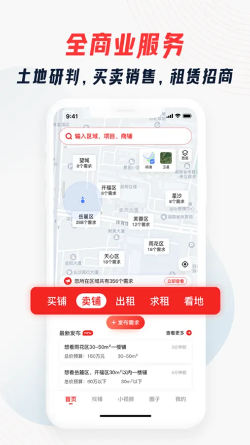 买卖商铺:展示商铺房源、客户买铺需求等信息
