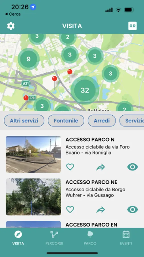 Visita il Parco tramite i punti di interesse presenti nell'app che non solo ti guideranno alla sua scoperta, ma ti consentiranno anche di raggiungere il Parco e i suoi servizi.