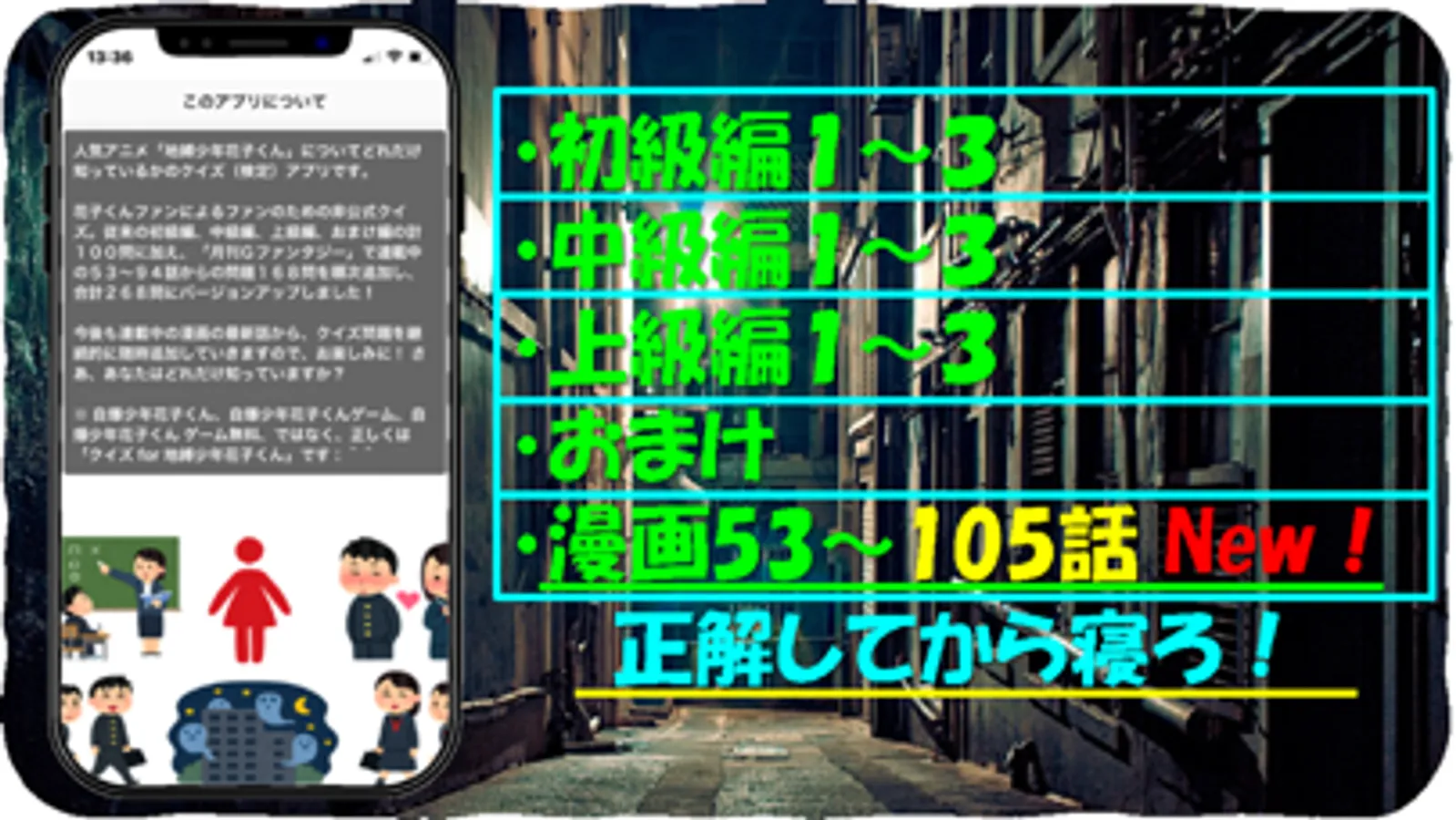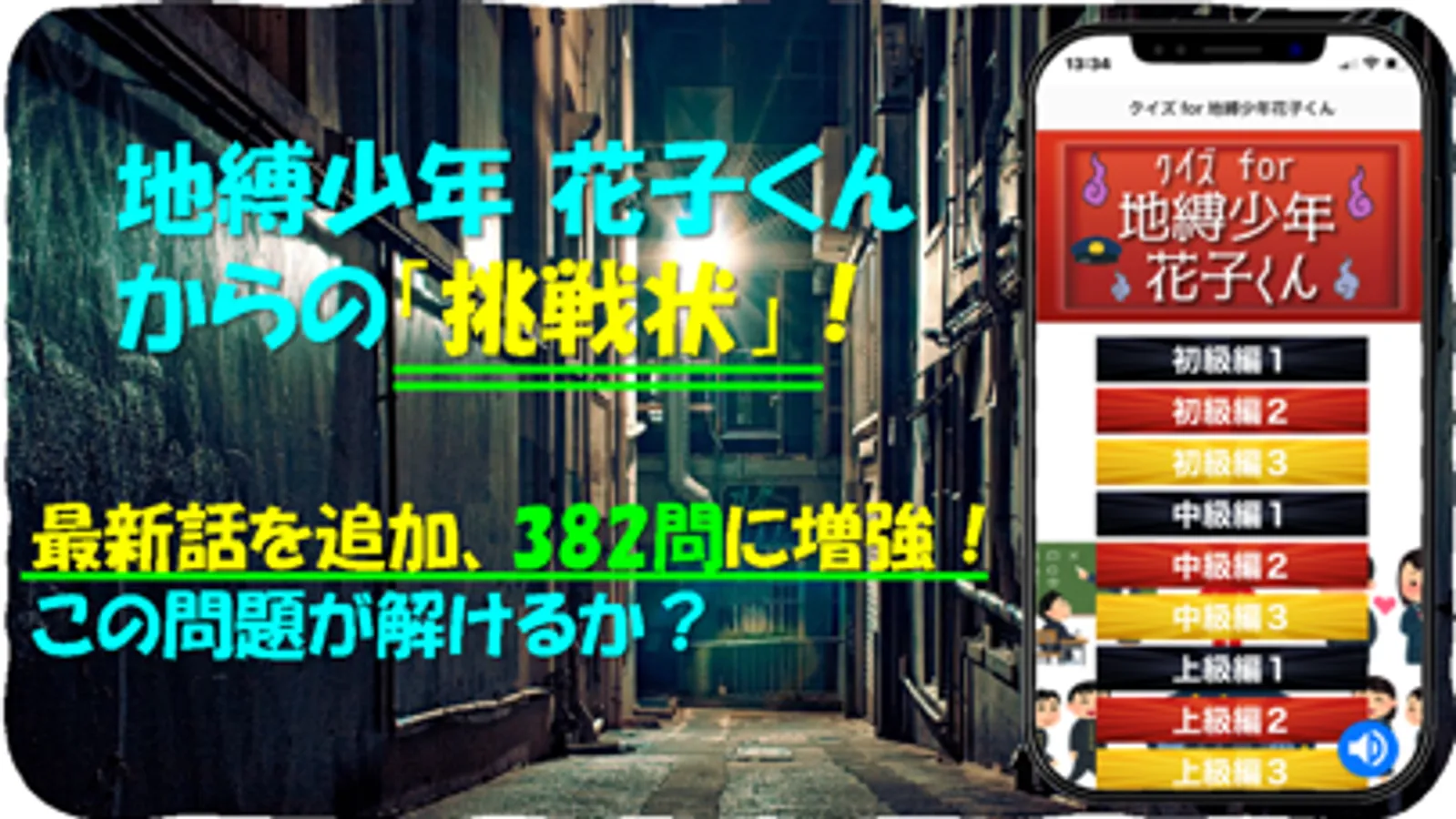人気アニメ「地縛少年花子くん」についてどれだけ知っているかのクイズ(検定)アプリです。