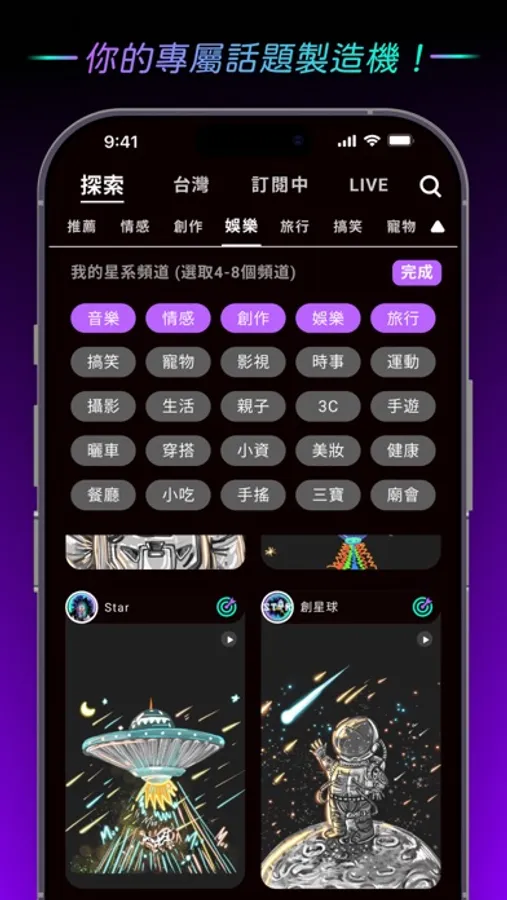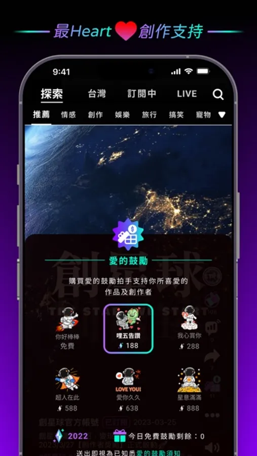 分享生活趣事、紀錄精彩時刻,專屬你的虛擬空間與創作舞台,玩轉你的獨特創意!多元的互動變現方式,為台灣創作者擁有更多曝光機會!